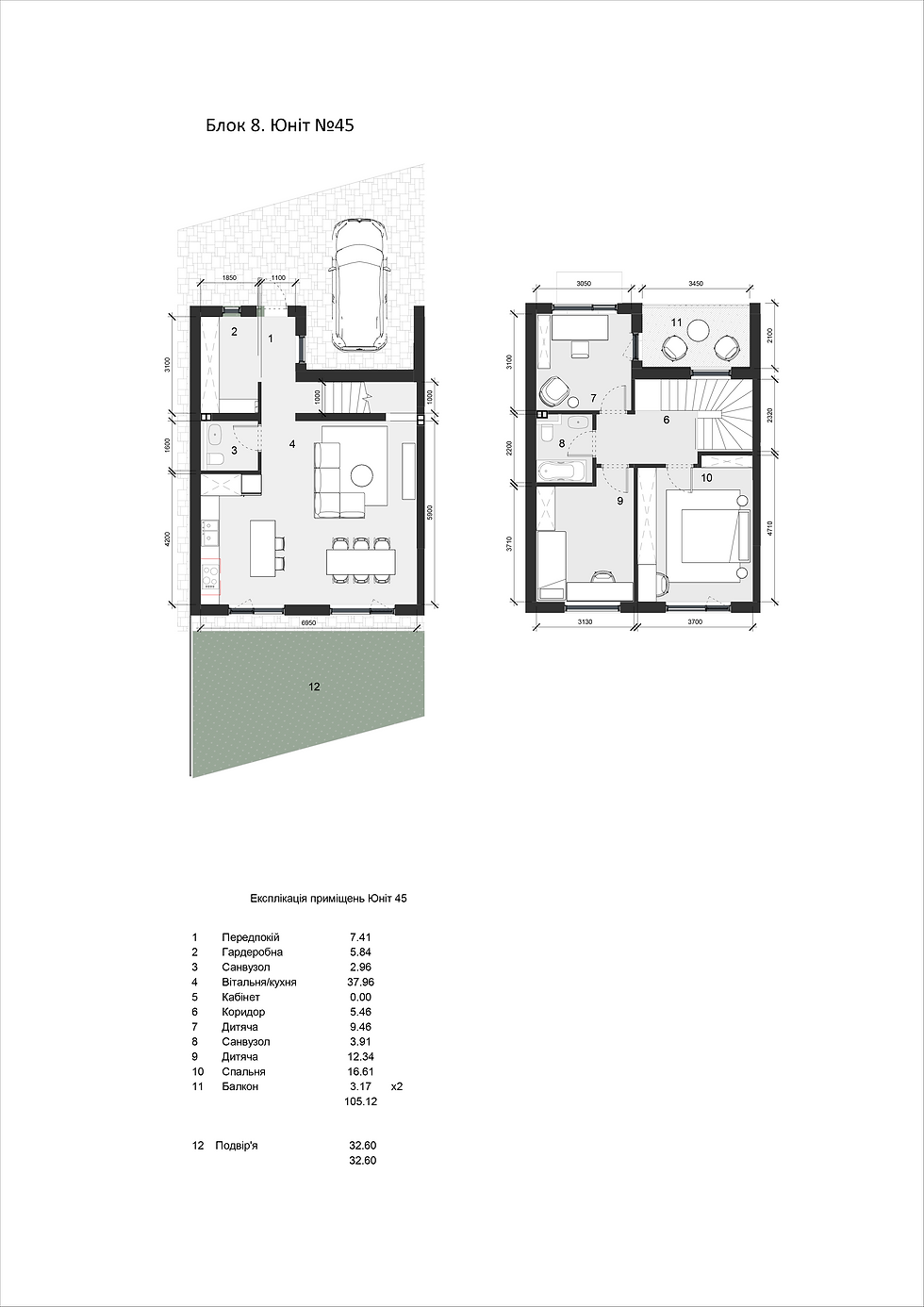 Дах: плоский, монолітні панелі перекриття утеплений 200мм екстрадований пінополістирол 200мм., стяжка, пвх мембрана, приховані водостоки.